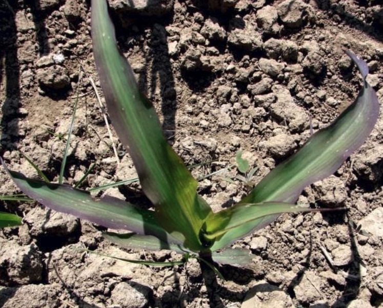 Poza deficienta fosfor la porumb: culoare violacee a frunzelor si tulpini